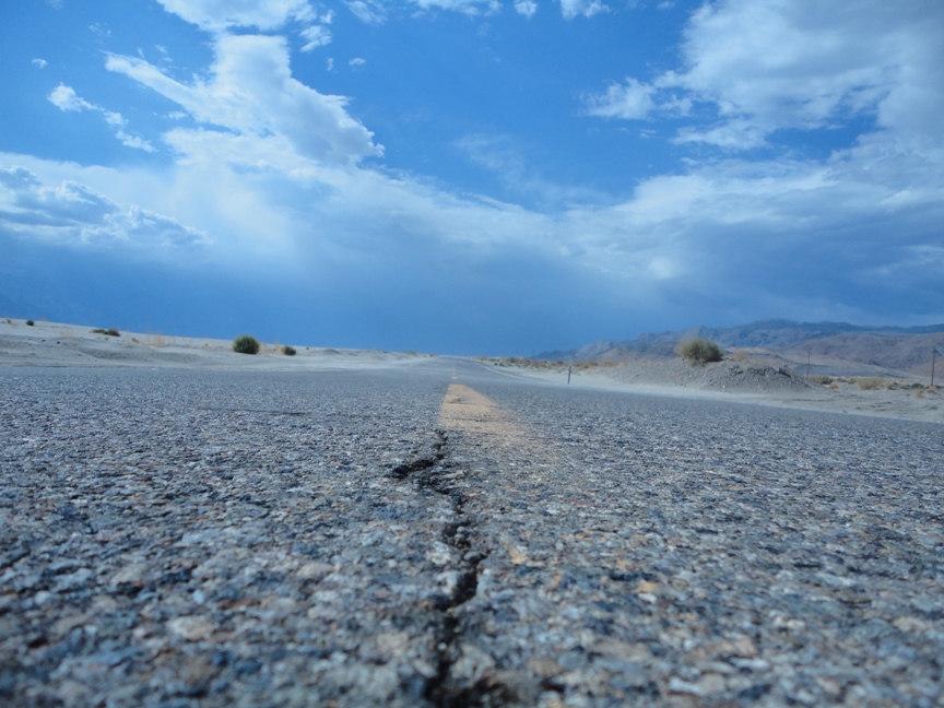 Once out of Yosemite National Park the landscape started to change subtly but surely. The next time we stopped we were in the middle of nowhere – probably the most desolate place I’d ever been at that point. We were just heading downhill from 9000 feet in Yosemite to a dusty epic landscape at 3000 feet at the start of Death Valley. Again, the place just felt unreal.