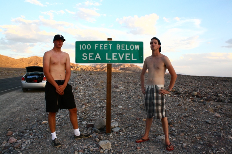 Later in the day one of us glanced at the dashboard and saw the temperature was increasing even further and we started taking a photo of the display every time it went up. Unbelievably, it got to 119°F in the evening. Believe me, that’s hot. We got out and I decided I was athletic enough to go for a short run in the desert. I don’t think I have ever sweated that much in my life. At one point I put my hand down on the back seat in a sticky puddle of goo, only to realise it used to be a cheese sandwich. That was when we realised keeping food in the car wasn’t a great idea at those kind of temperatures. We also stopped at a sign that said we had reached sea level, yet there was no water to be seen for the miles and miles you could see in every direction. That was a great opportunity to film a hilarious video of us skimming stones. By now the heat had definitely gotten to us!