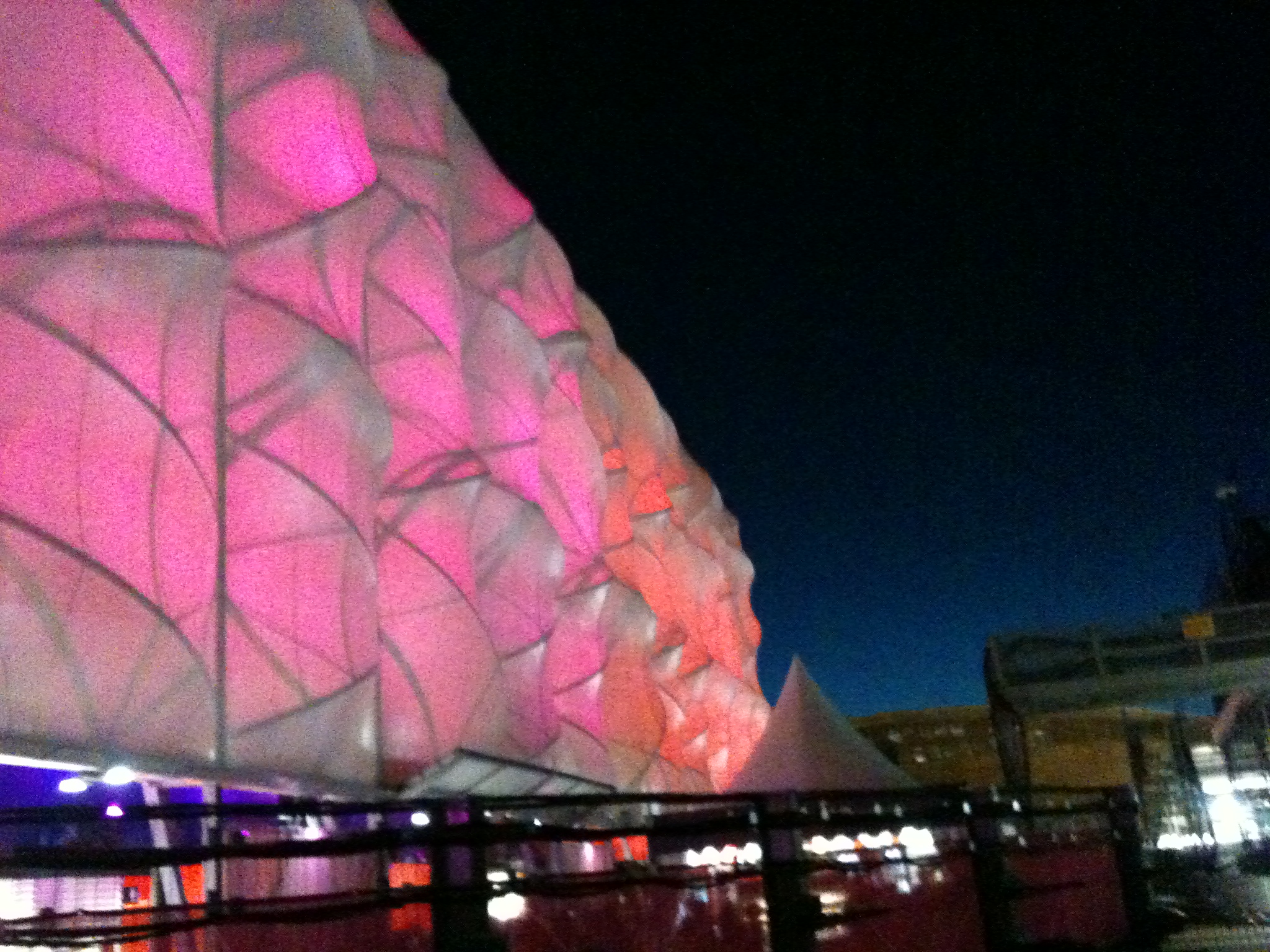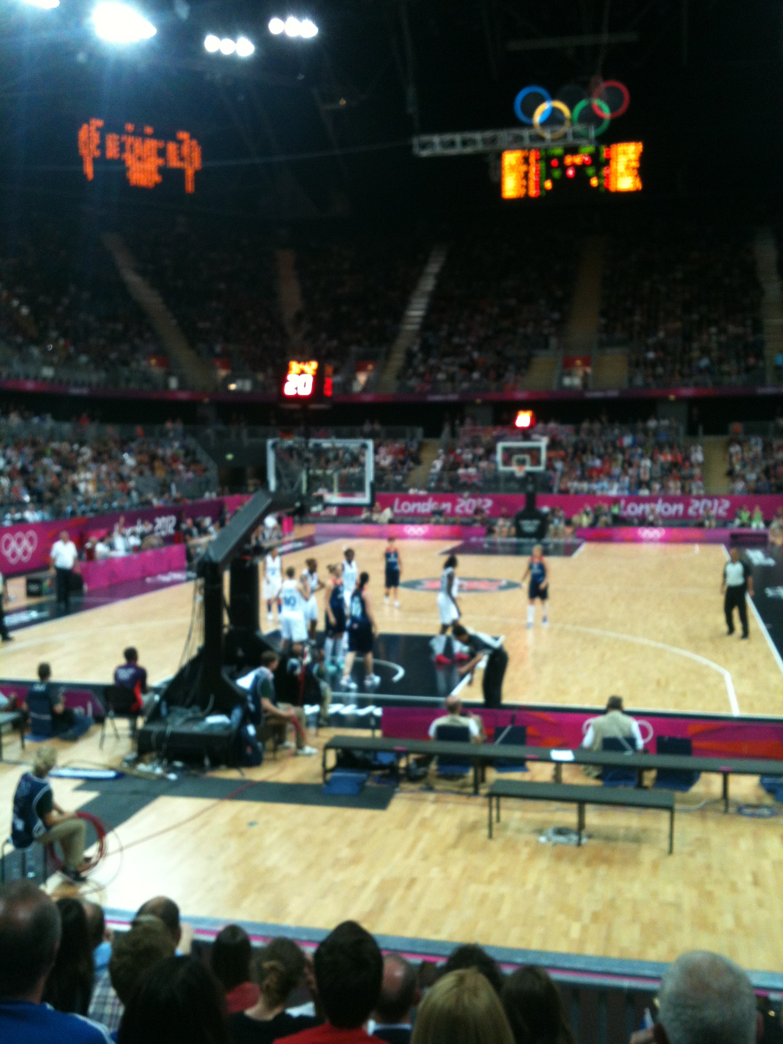 A couple of days later I managed to get into the Velodrome. It was a last minute thing and we were not allowed to wear work uniforms so we quickly went to the London 2012 shop and bought ourselves t-shirts! We ran across to the venue in time to see Team GB win two gold medals, including my hero Victoria Pendleton – just unbelievable. The velodrome is like no other venue for noise, look and shape. A text came through from our friend saying “just saw you on TV in the crowd at the velodrome!” It was a phenomenal atmosphere and I thought the night could not get any better until immediately afterwards we managed to get into basketball for a women’s Team GB match – incredible! The ludicrous night continued when myself and my friend were dancing in the crowd and a young man approached us. I assumed we were in his seat or something but he said he had seen us dancing and asked us to be part of a dance off in front of the whole arena at half time! Stupidly we said yes and ended up following on the cheerleaders to dance with just two other people. It was boys versus girls and despite some impressive “virtual basketball” dance moves from myself and some guy I had just met, the girls won on a crowd vote. Apparently we were on the BBC Red Button dancing! Sadly Team GB lost in overtime to Team France in a nail-biting super-close encounter. But what a night! The basketball arena actually looks inflatable up close and, along with many other venues on the park, looks amazing at night. Outside The Velodrome