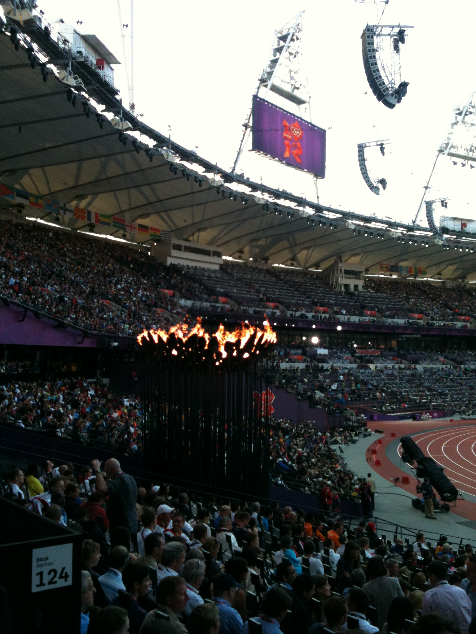 12.34 am The young athletes ignite the torch made up of the copper petals brought in to the stadium by each of the 204 participating countries. They rise to from a spectacular bowl of unity. Obviously, this did not happen in the rehearsal I witnessed and the exact form of the torch was kept a closely guarded secret. The bowl echoes the place of the torch in the 1948 Olympic Games, and was similarly later moved to the side of the stadium.