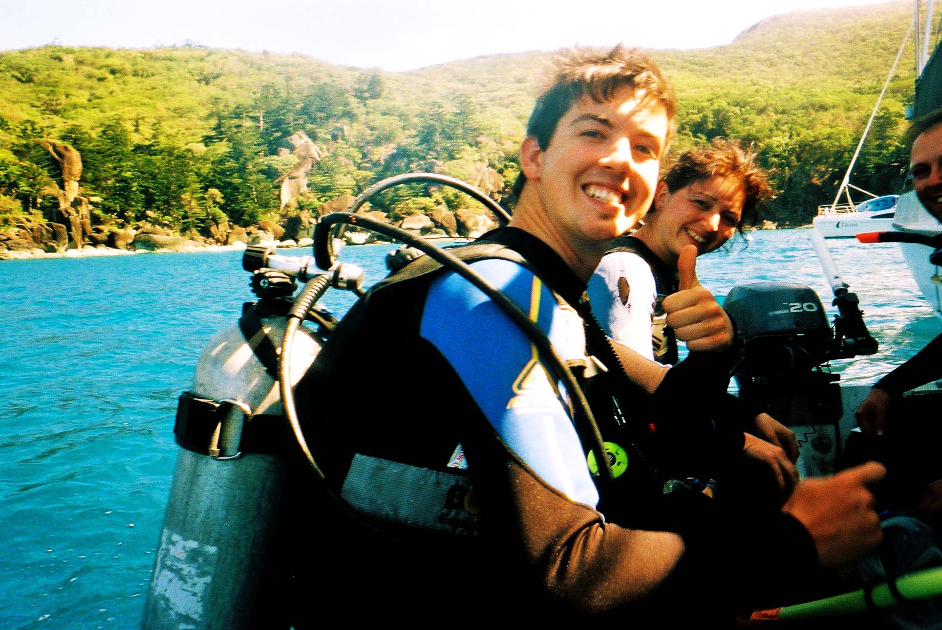I was pretty nervous about diving, especially when Storm and the four of us diving got to the beach in all our dive gear – mask, flippers, regulator and oxygen tank. Going underwater and knowing that you will not be coming up to breathe for twenty minutes was a very hard concept to get my head around for the first time. Underwater breathing is so freaky and initially very hard but as soon as we got down I calmed and my breathing improved by itself. Panicking is the worst thing you can do diving and most things can be resolved without having to go back to the surface. Almost straightway, George swam by and everything felt awesome! He was so big and I stroked him as he followed us for the entire 20 minutes – I later found that the crew in the boat circling above us were chucking down food to encourage the fish to swim with us, a trick which certainly worked! Diving was everything I had imagined and more, especially somewhere that beautiful. There was a whole new world down there to discover and it’s such a buzz to float, glide and explore in three dimensions rather than traverse flat ground in two as normal. Our trip took us in a large circle and we saw so many gorgeous fish and Great Barrier Reef coral.
