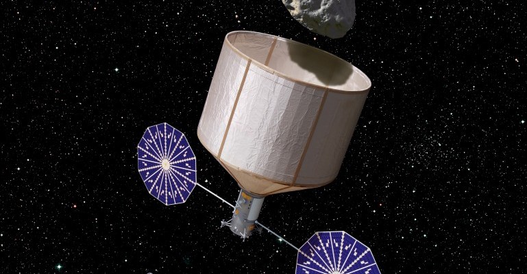 The spacecraft would be delivered to low Earth orbit by a launch vehicle and would then take four years to reach the asteroid, powered by a solar electric propulsion system. The craft would take 90 days to study the asteroid’s size, rotation and surface topography at infrared and visible wavelengths and attempt to match its rotation. A 15 metre wide inflatable drawstring bag would be deployed to capture the asteroid, secure it against a ring to control its centre of mass, and apply forces and torques to stabilise it. If the asteroid was comprised of rubble rather than one individual rock, a “snow blower” could be used to suck the rocks into the bag using a spinning blade. (Unlike a terrestrial snow blower, there would be no escaping air to take into account.) The craft would transport the asteroid to the Earth Moon system and remain with it to support visiting humans in developing ways to extract asteroid resources.