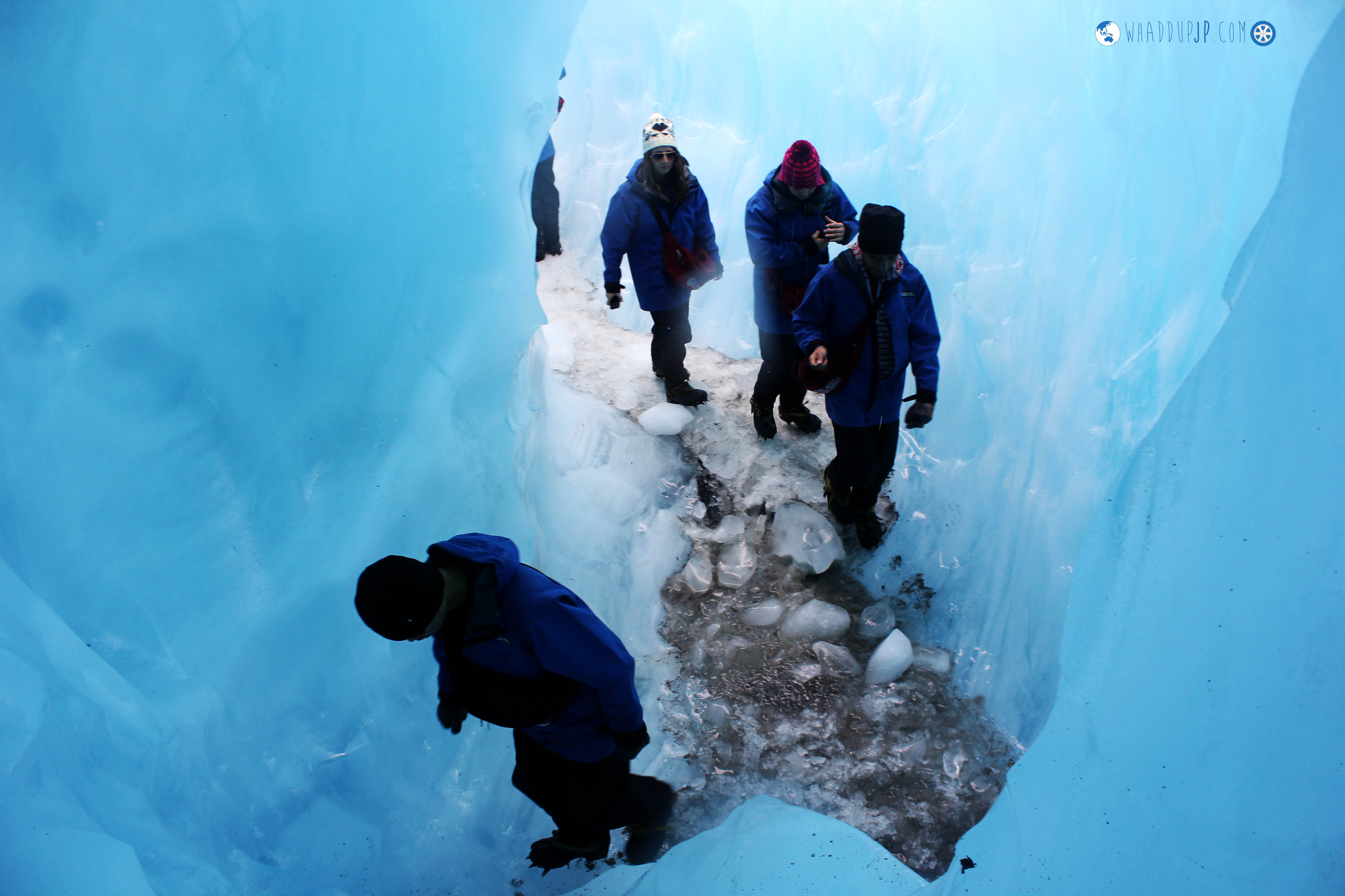 It turned out two large blocks of ice from the slowly melting walls of the ‘Holy Grail’ had collapsed spectacularly onto the floor below up ahead. A second guide arrived to smash the rest of it down, preventing any sudden collapse once we got there. You see, glaciers are ever changing, moving one metre a day downhill – the Holy Grail was only ever going to exist for 2-3 months maximum, and the entire landscape changes every month or so. Hence Ti never gets bored on his job – imagine going into the office each day to see that everything had moved by one metre, old furniture had come crashing down, new formations had appeared and the very structure of the building evolved into something completely new every few weeks.