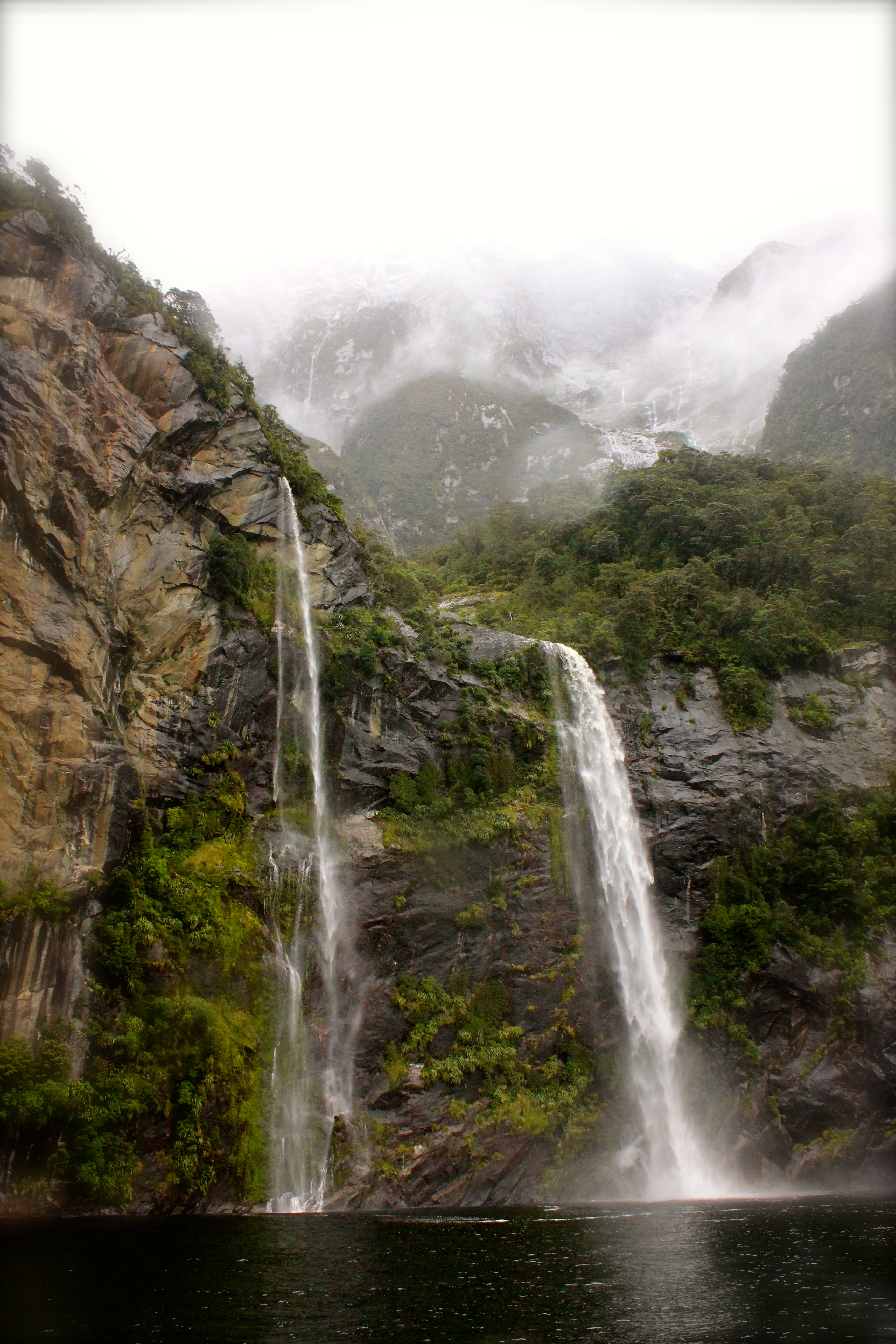 It was a dramatic drive past the Southern Alps crossing to the ‘West Coast’ (anything west of the Alps counts apparently, we were still about 80 kilometres from the actual coast at this point). Heavy rain and clouds casually hung in the epic valleys amongst fast-flowing waterfalls and streams. Interestingly, the waterfalls are temporary in that they come and go with the rain. The vast cliff-faces looked like a CGI movie – too majestic and gigantic to be real. Lots of the Lord of the Rings trilogy was filmed around Fiordland.