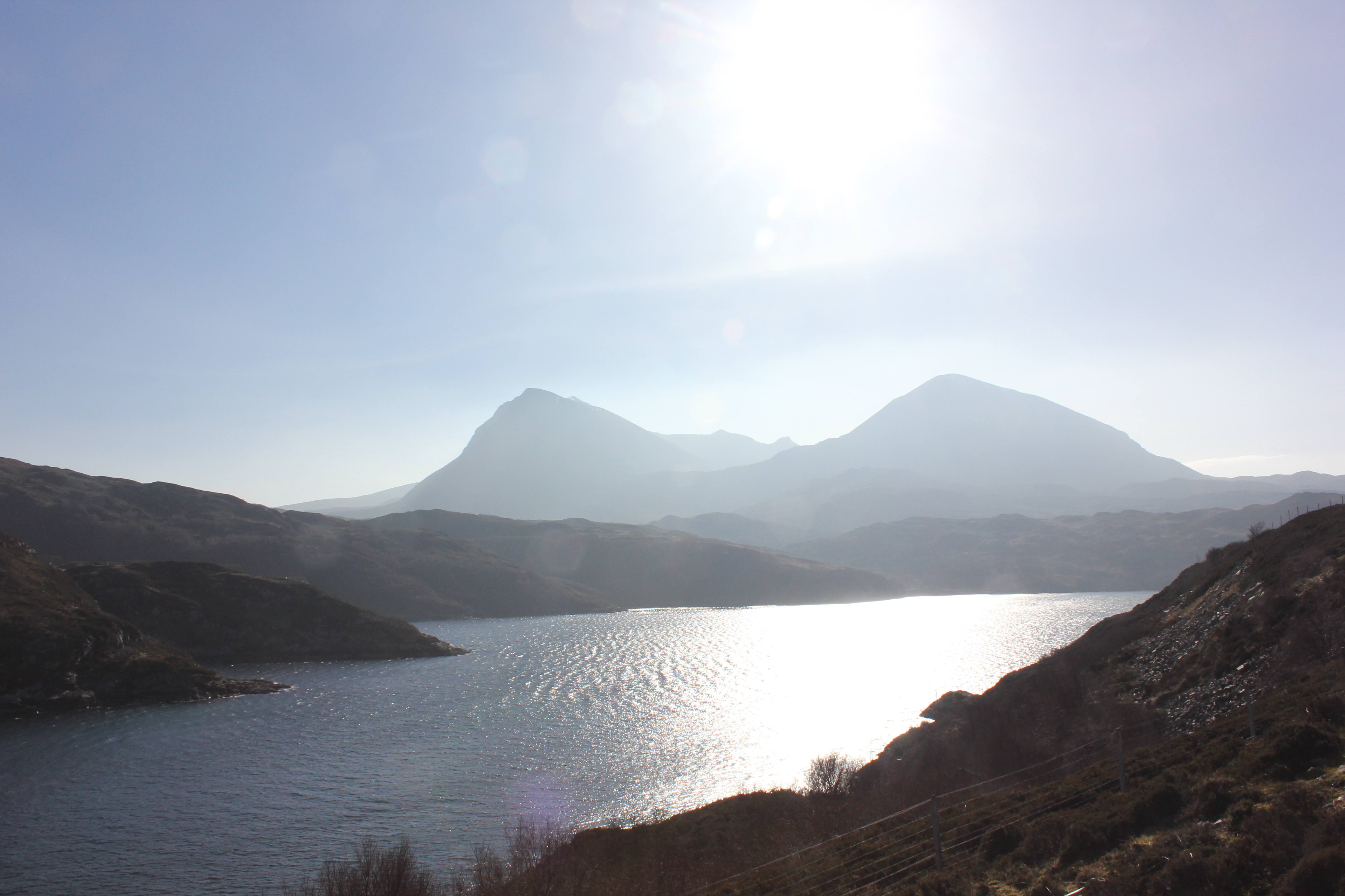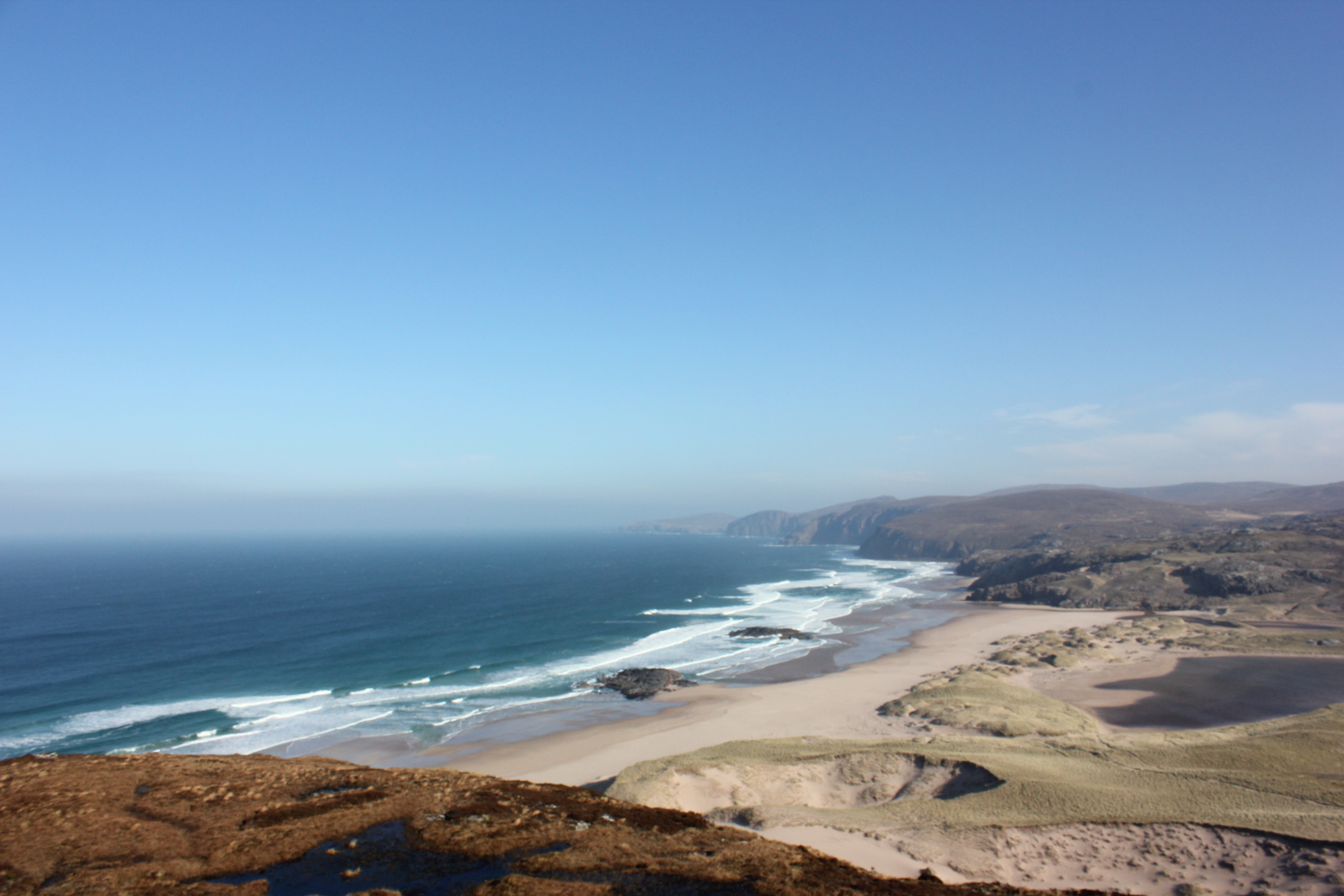 We pulled up at Blairmore and began the hike to Sandwood Bay, which we’d heard was worth the walk. We passed Loch Aisir, Loch na Gainimh, Loch a’ Mhuilinn, Loch Meadhonach and Loch Clais nan Coinneal and clambered around Druim na Buainn hill before finally reaching Sandwood Loch. The landscape opened up and we were greeted by a magnificent view of Sandwood Bay, with its unspoilt sand dunes and offshore island dazzling in the sunshine.