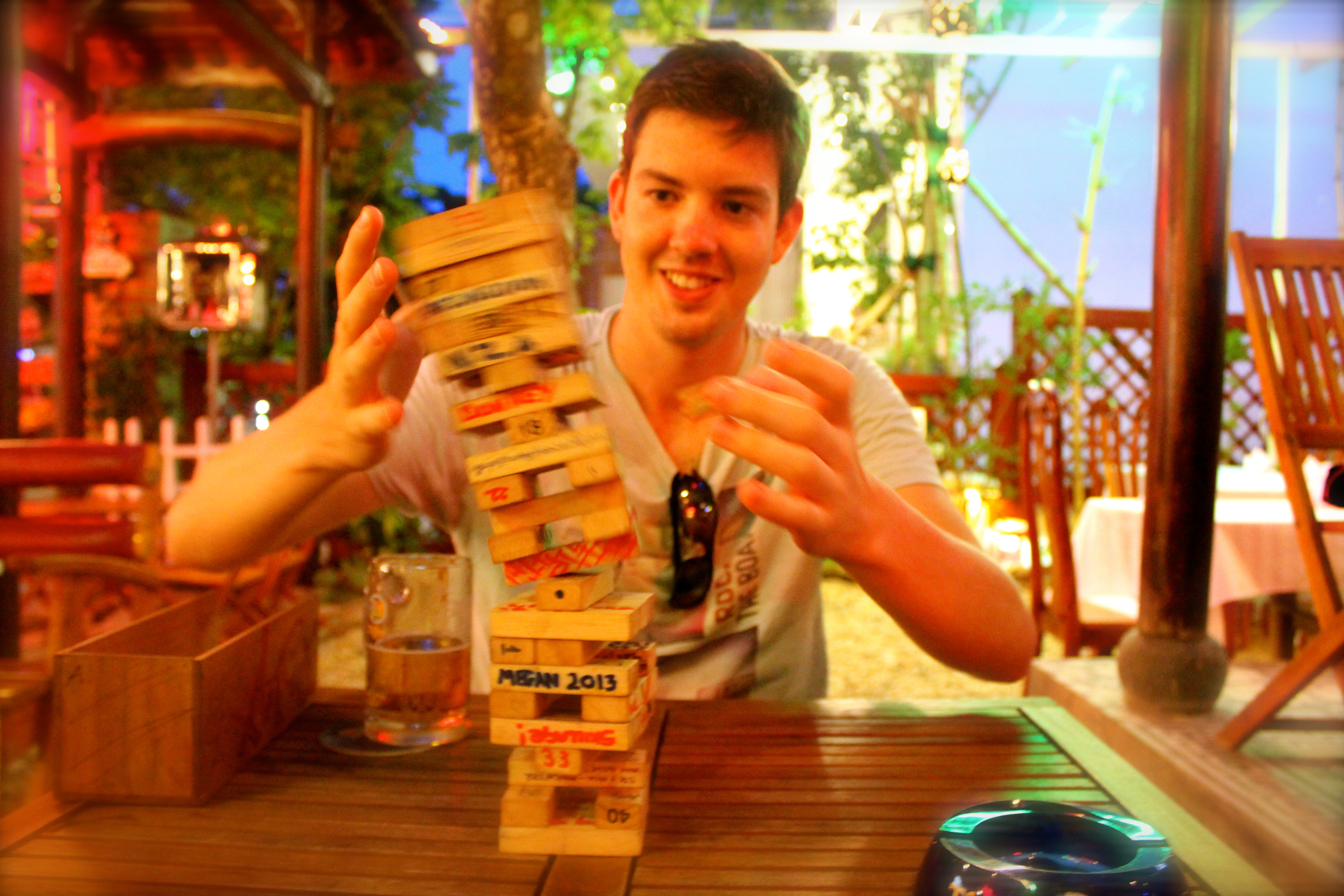 We hid from the heat in the afternoon in our air conditioned room, before taking a walk around the town centre and down to the river. It was very picturesque but we got accosted quite a lot by people trying to sell us boat trips. One of the streets seemed friendly and backpacker-y and all the restaurants looked good so Jodes chose the one with the pretty lights, Le’s Gardens. It turned out to be an inspired choice as the staff were really friendly and our waitress Nhan insisted on bringing out jenga and playing with us! Le’s Gardens had nice food, too and we gave Nhan a tip – something we hadn’t done in Asia thus far.