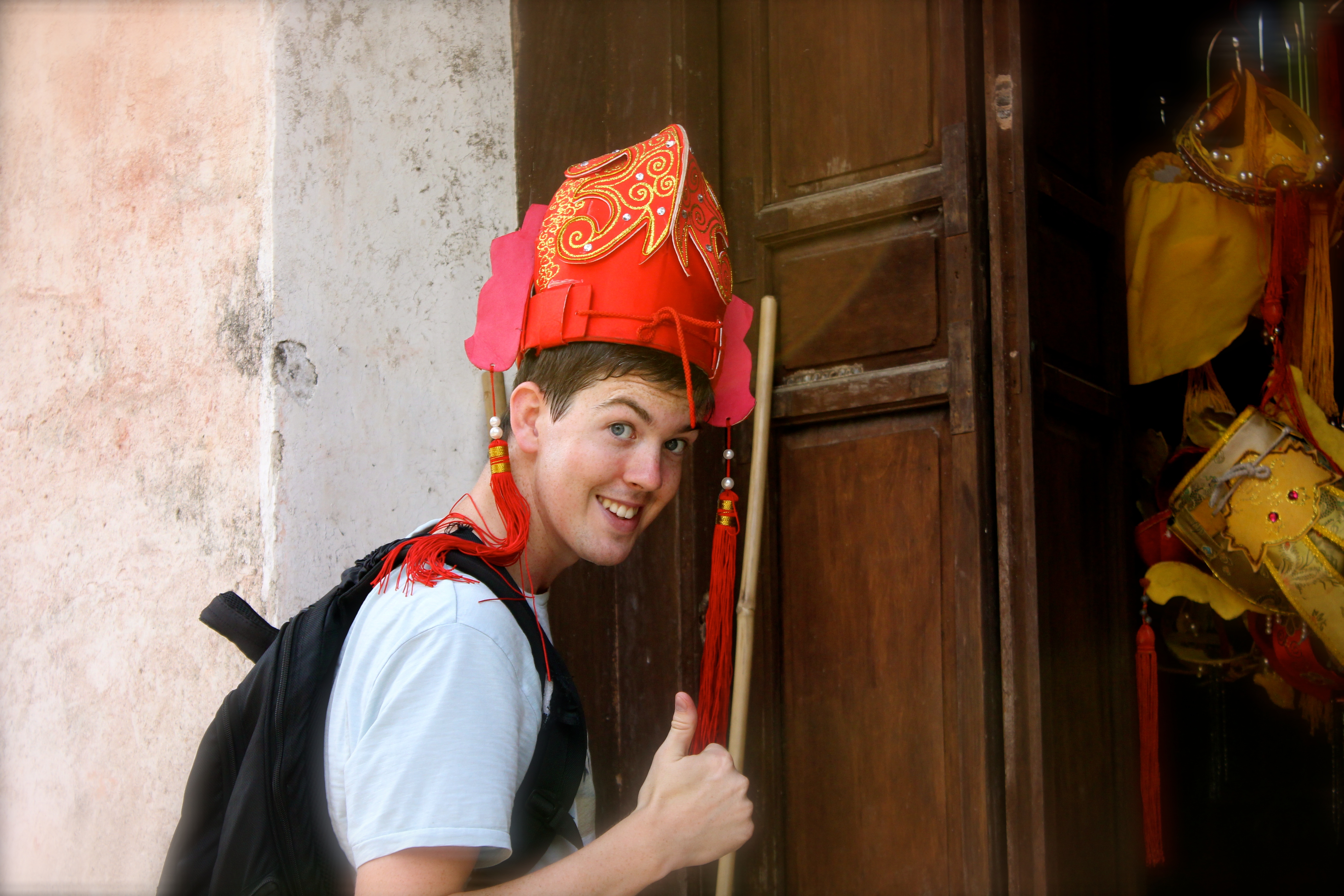 The next morning we had a great pancake breakfast brought to our room. We hired motorbikes and drivers to take us round the Huế surrounding area. Our first stop was the Tu Hieu Pagoda, a peaceful monastery active monks and with a pretty fish pond (I even spotted a tortoise!) Back on the bikes it felt so fun and perfect to be catching a cool breeze in the already stifling sun. After a brief stop at the incense stick makers, we arrived at the Tomb of Tu Duc, the former emperor of Vietnam. Tu Duc had 104 wives and survived an attempted coup from the many servants he had to build him the impressive complex between 1864 and 1867. Central is the Luu Khiem Lake he used to row across to reach a purpose built island to hunt game. Opposite is Xhung Khiem pavilion where he used to write poetry. The main tombs were cool and the Chamber, used as a theatre, had emperor and empress outfits to dress up in. Naturally I couln’t resist…