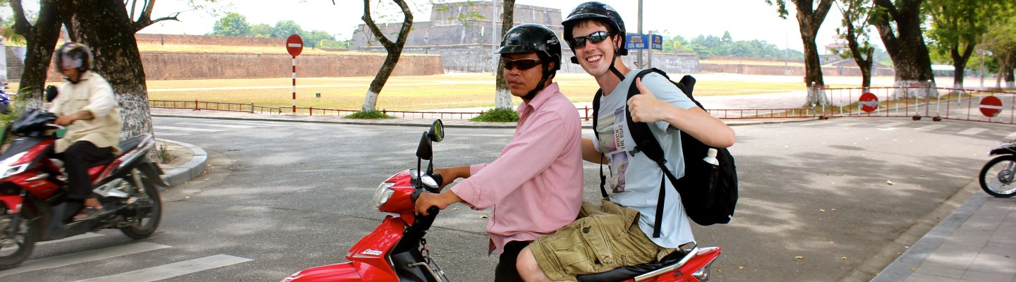 Our bus broke down in Huế so we got off and searched for the Binh Duong Hotel ourselves. Of course, almost as soon as we had alighted the bus got fixed and overtook us leaving us to struggle down strange roads in the blistering heat. Mercifully, a man approached us just as we were overheating, holding a board with Jodie’s name on it. Thinking this was yet another local trying to sell us something, we were ready to give the stock answer không cám ơn (no, thank you in Vietnamese) when we read the board and realised he was after us!