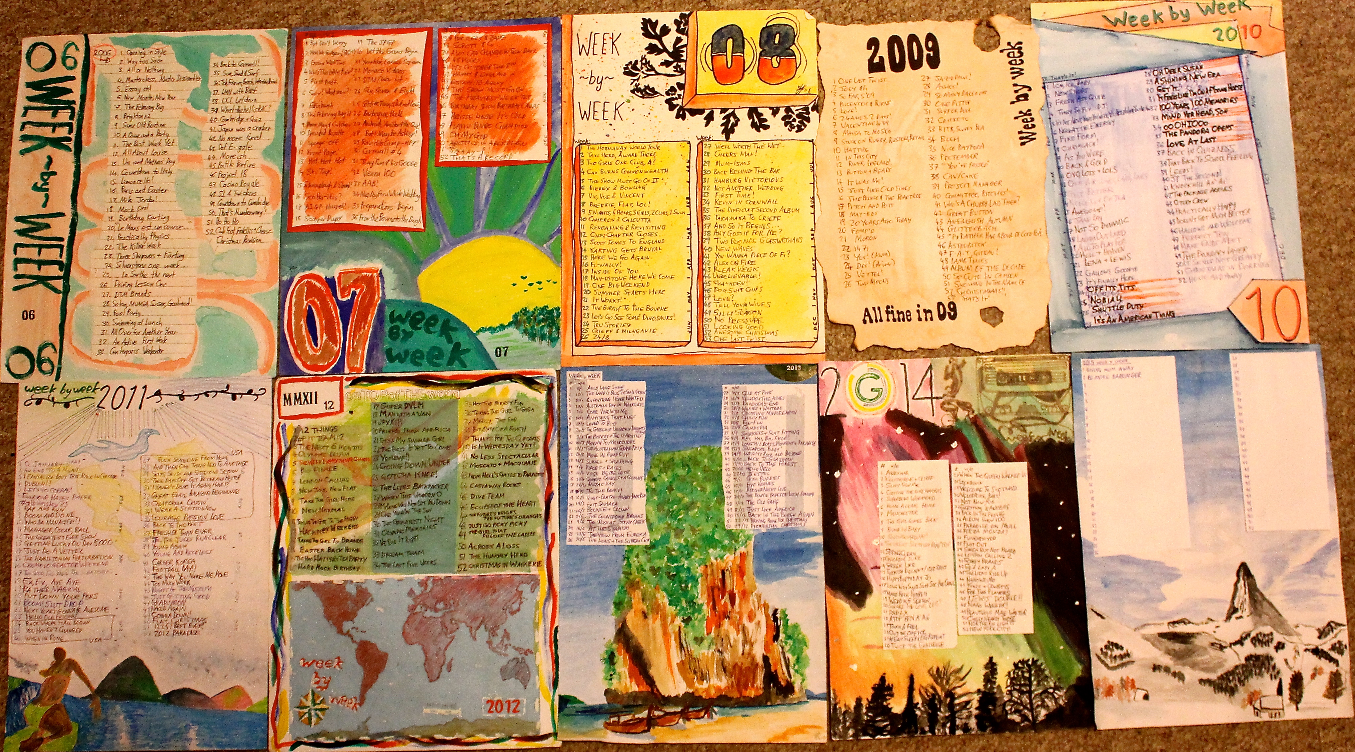 Some of them I can’t even remember the meaning of now, but most are familiar landmarks in my last nine years. It helps me put things in perspective, and each year I paint a nice background to make them more visually pleasing.