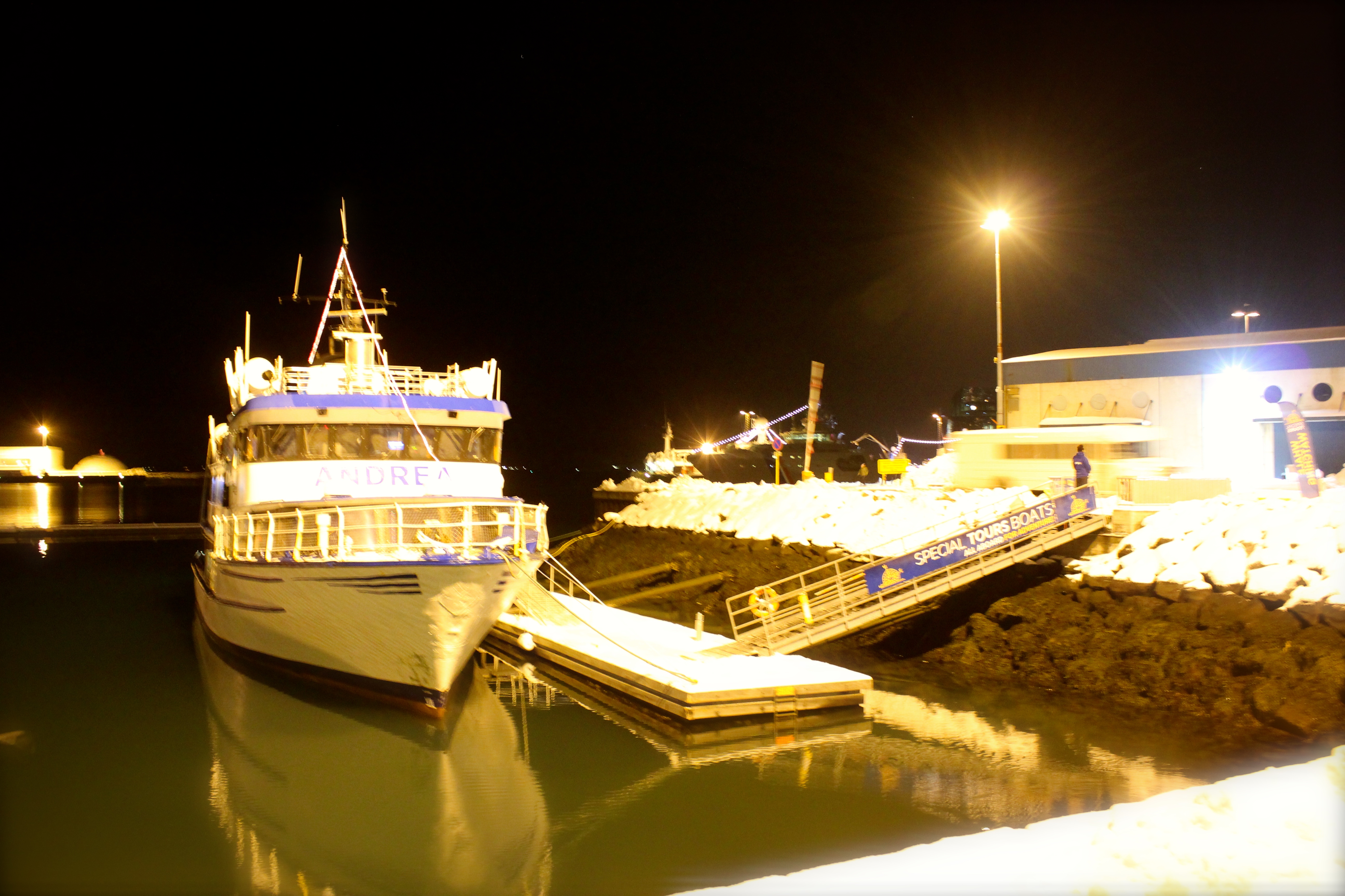 We were picked up from our Reykjavik hotel by the Special Tours minibus we had booked through Reykjavik Excursions. Once at the harbour, we collected our Northern Lights tour tickets and shuffled round on the ice to our boat, the Andrea. The tour had been cancelled two days earlier due to inclement weather but the night before they had seen a marvellous auroral display apparently. Our skies were clear and full of stars, a promising sign as we boarded the slippery deck and made our way inside the boat. The Andrea is also used for whale watching tours and the layout was similar to that of whale watching tour boats in Sydney. The guide pointing out the local harbour sights over the tannoy had a brilliant sense of humour and the whole trip felt fun, we were getting a true Icelandic welcome.
